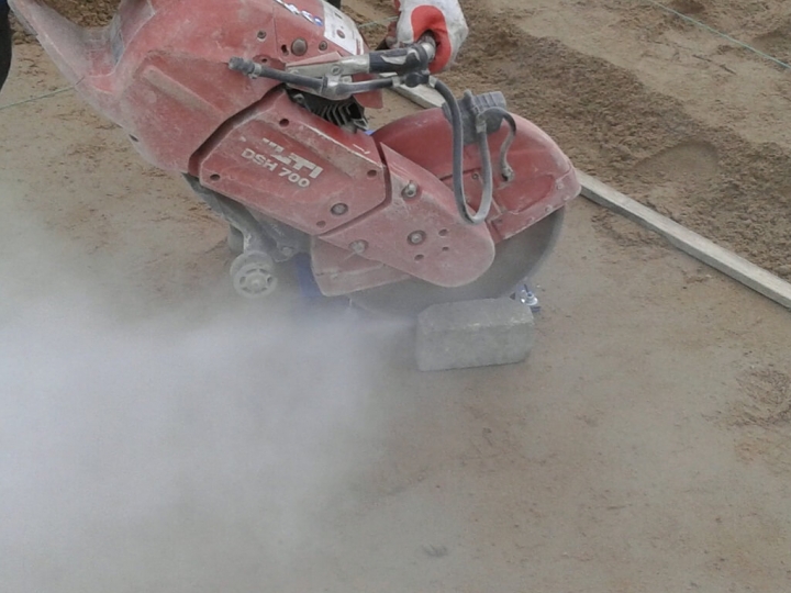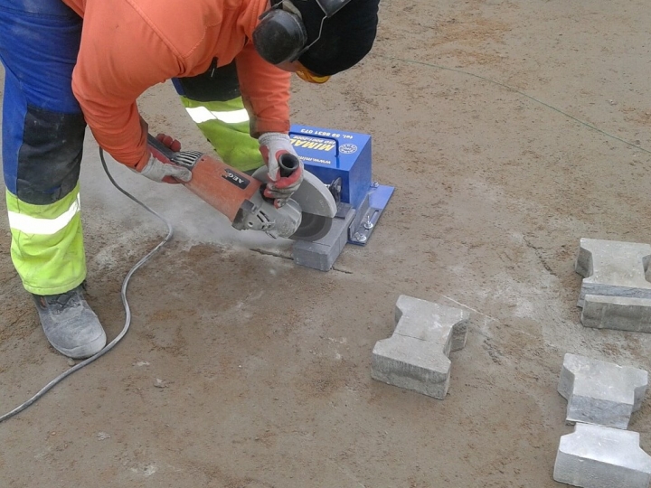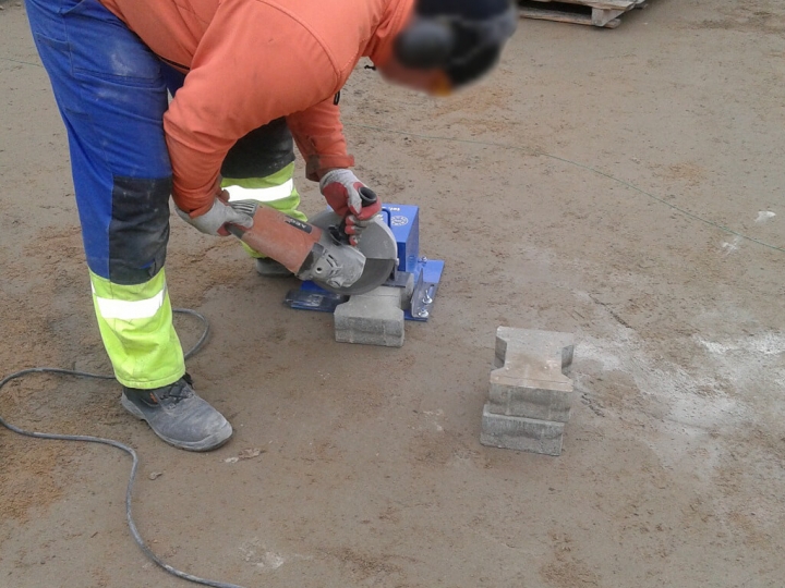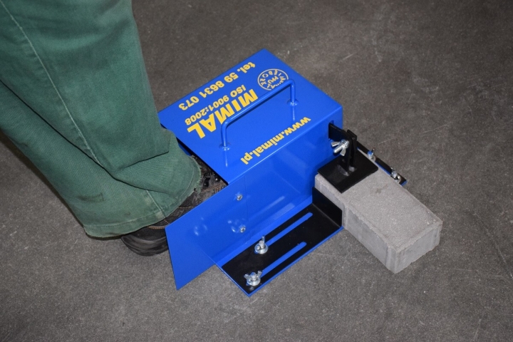 Trzymak kostki służy do bezpiecznego przytrzymywania kostki brukowej podczas przycinania jej na odpowiednią długość lub szerokość, nie ryzykując przy tym uszkodzenia stopy. Urządzenie posiada płynną regulację szerokości oraz stopniową regulację wysokości mocowania kostki. Rączka na obudowie ułatwia jego transport na terenie budowy.